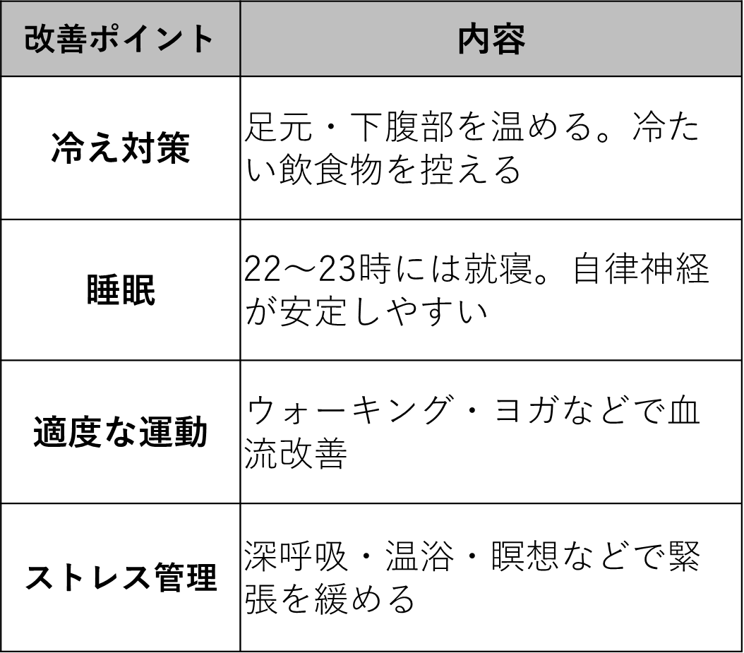 - 下腹部と足首の保温(冷えは悪化因子)